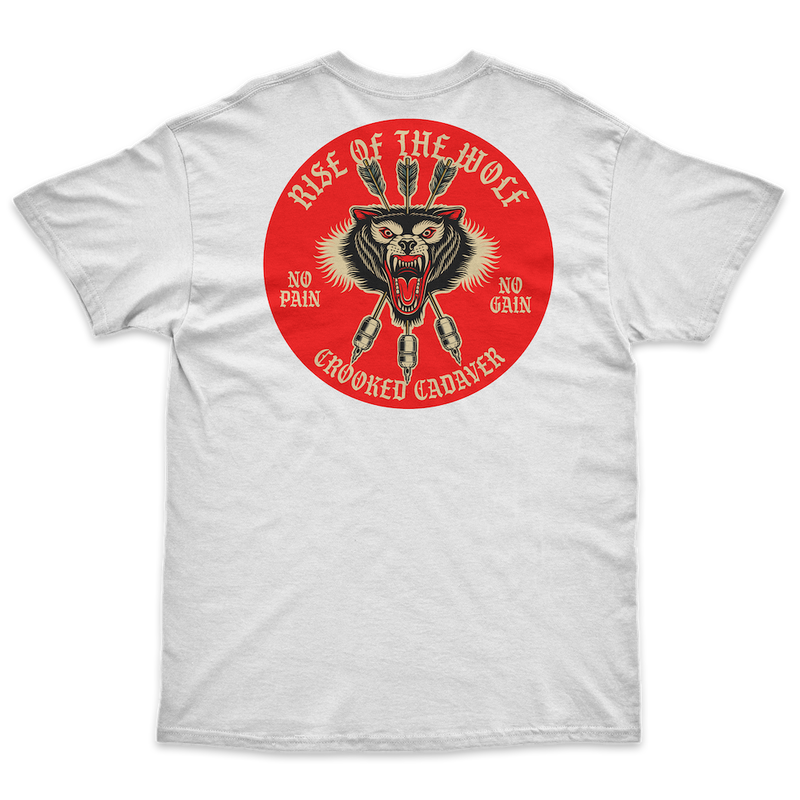 The NO PAIN NO GAIN TEE from Crooked Clubhouse is a must-have for your wardrobe. Part of the Crooked Cadaver Collection, this white crew neck tee features a front and back design that will make you stand out. Get ready to conquer the day in style!